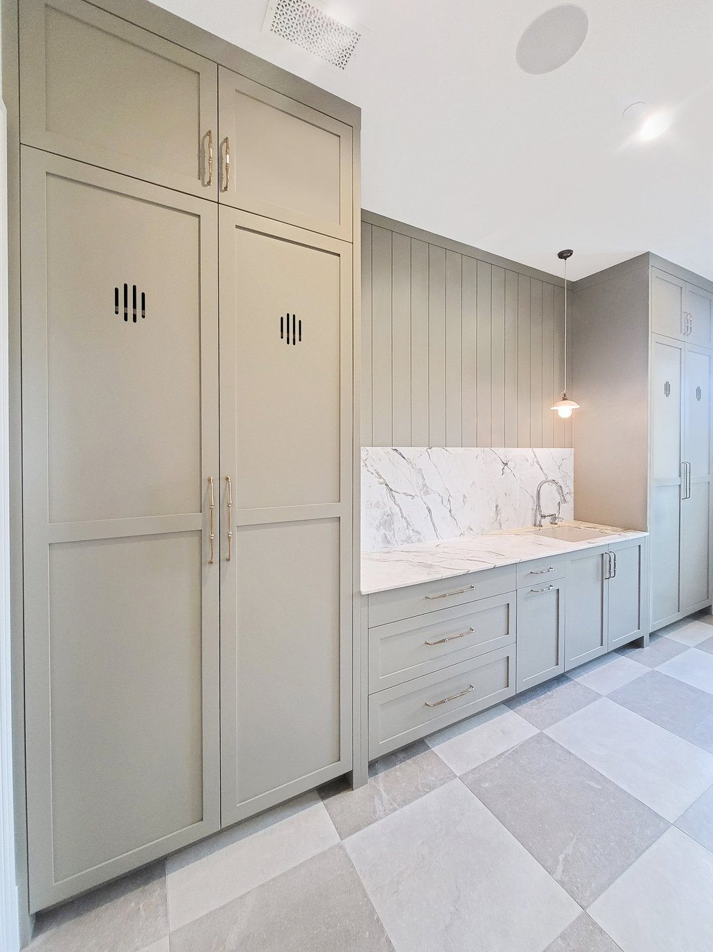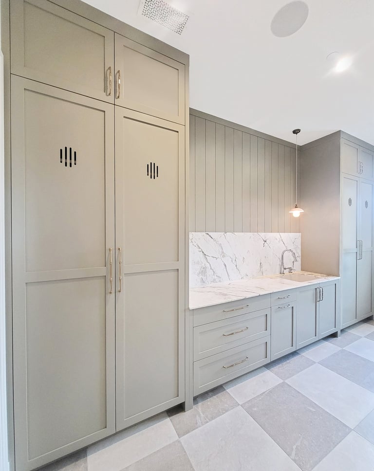 Your laundry room can transform into a joyful space where chores feel less daunting. Imagine sleek, functional cabinets that not only provide ample storage for hampers and baskets but also accommodate a designated charging area for your devices. A tall cabinet can house brooms and cleaning supplies, keeping your essentials organized and within reach. To enhance the ambiance, incorporate lighted shelves that showcase your favorite art projects, adding a personal touch that sparks creativity. With thoughtful design and attention to detail, your laundry room can become a bright, happy retreat where you enjoy tackling everyday tasks.